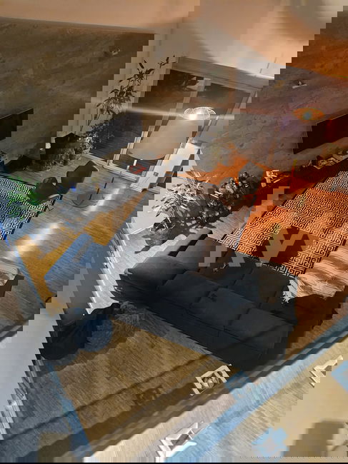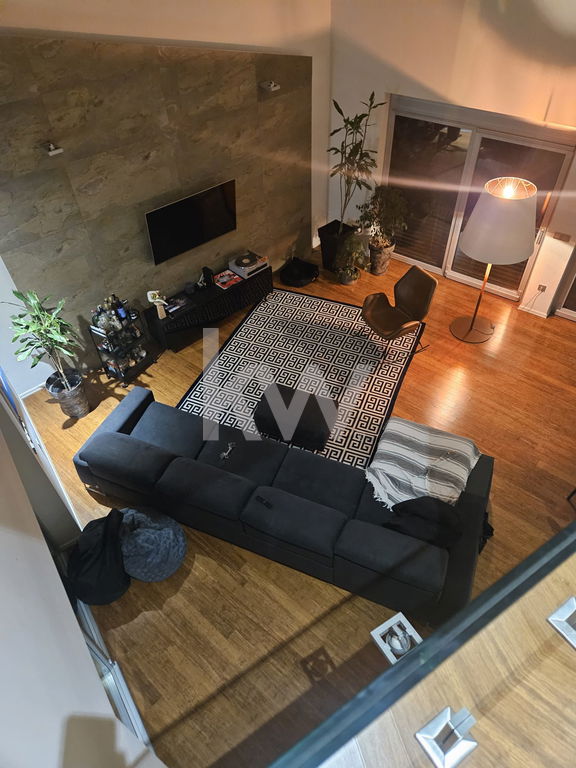 Prostoren dnevni prostor galerijske izvedbe, povezan s kuhinjo in jedilnico ter izhodom na teraso