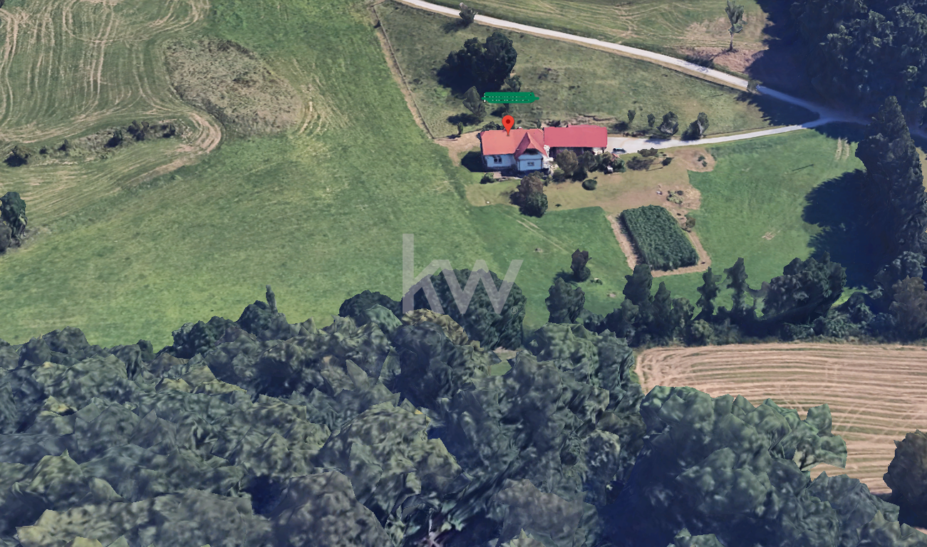 Ob hiši se razprostira 22.315 m² zemljišča, rahlo v naklonu, ob lokalni asfaltni cesti.