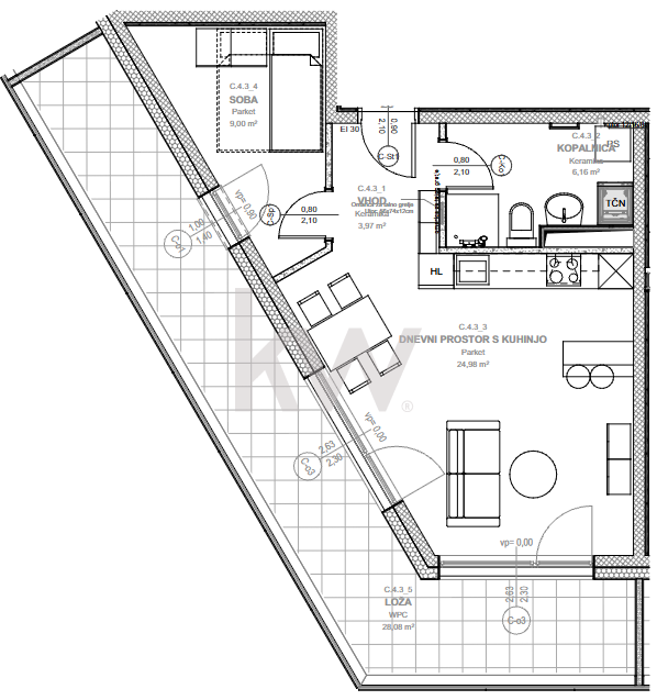 Stanovanje zajema: vhod 3,97 m2, dnevni prostor s kuhinjo in jedilnico 24,98 m2 z izhodom na ložo, spalnica 9,00 m2, kopalnica 6,16 m2, skupaj bivalno: 44,11 m2, ostalo: loža: 28,08 m2, shramba v kletnem prostoru 3,61 m2, lastniško parkirno mesto v garaži.