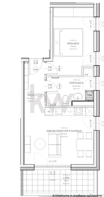 Stanovanje zajema: vhod 4,83 m2, dnevni prostor s kuhinjo in jedilnico 20,46 m2 z izhodom na ložo, spalnica 14,19 m2 z izhodom na ložo, kopalnica 6,91 m2, bivalno skupaj: 46,39 m², ostalo: loža: 9,65 m2, shramba v kletnem prostoru 3 m2, lastniško parkirno mesto v garaži.